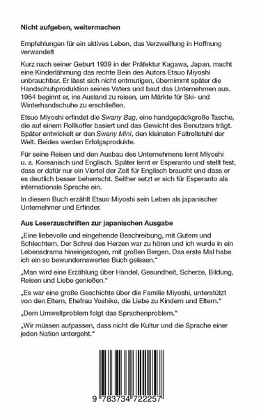 Nicht aufgeben, weitermachenEmpfehlungen für ein aktives Leben, das Verzweiflung in Hoffnung verwandeltKurz nach seiner Geburt 1939 in der Präfektur Kagawa, Japan, macht eine Kinderlähmung das rechte Bein des Autors Etsuo Miyoshi unbrauchbar. Er lässt sich nicht entmutigen, übernimmt später die Handschuhproduktion seines Vaters und baut das Unternehmen aus. 1964 beginnt er, ins Ausland zu reisen, um Märkte für Ski- und Winterhandschuhe zu erschließen.Etsuo Miyoshi erfindet die Swany Bag, eine handgepäckgroße Tasche, die auf einem Rollkoffer basiert und das Gewicht des Benutzers trägt. Später entwickelt er den Swany Mini, den kleinsten Faltrollstuhl der Welt. Beides werden Erfolgsprodukte.Für seine Reisen und den Ausbau des Unternehmens lernt Miyoshi u. a. Koreanisch und Englisch. Später lernt er Esperanto und stellt fest, dass er dafür nur ein Viertel der Zeit für Englisch braucht und dass er es deutlich besser beherrscht. Seither setzt er sich für Esperanto als internationale Sprache ein.In diesem Buch erzählt Etsuo Miyoshi sein Leben als japanischer Unternehmer und Erfinder.Aus Leserzuschriften zur japanischen Ausgabe"Eine liebevolle und eingehende Beschreibung, mit Gutem und Schlechtem. Der Schrei des Herzen war zu hören und ich wurde in ein Lebensdrama hineingezogen, mit großen Bergen. Das erste Mal habe ich ein so bewundernswertes Buch gelesen.""Man wird eine Erzählung über Handel, Gesundheit, Scherze, Bildung, Reisen und Liebe genießen.""Es war eine große Geschichte über die Familie Miyoshi, unterstützt von den Eltern, Ehefrau Yoshiko, die Liebe zu Kindern und Eltern.""Dem Umweltproblem folgt das Sprachenproblem.Wir müssen aufpassen, dass nicht die Kultur und die Sprache einer jeden Nation untergeht."
