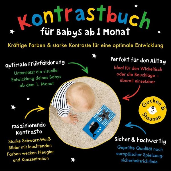 Frühförderung für die Allerkleinsten: Die kontrastreichen Bilder unterstützen die visuelle Entwicklung auf spielerische Art und WeiseBabys erstes Lieblingsbuch: Starke Schwarz-Weiß-Kontraste, ergänzt um die Grundfarben Rot, Blau, Grün und Gelb, wecken das Interesse der Kleinsten und fördern die Konzentration