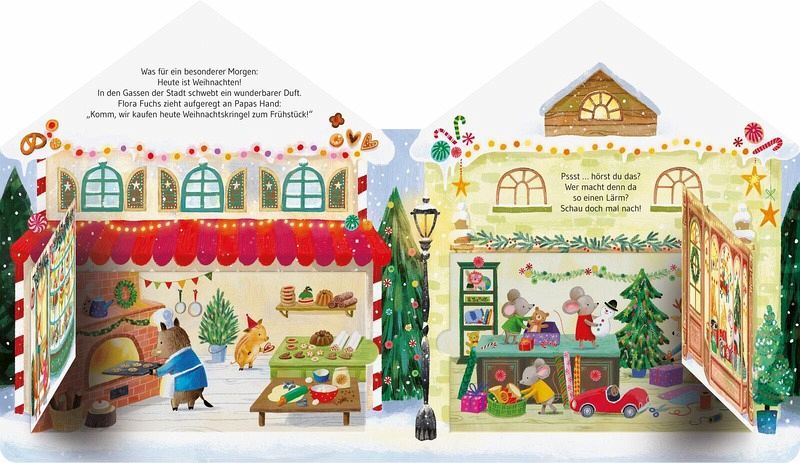 Hier darf man, was ansonsten vor Weihnachten streng verboten ist: hinter alle Türen und Fenster schauen! Denn 24 zauberhafte Überraschungen verkürzen für Kinder ab 18 Monaten die Wartezeit bis zum schönsten Fest des Jahres. Was gibt es bei Familie Fuchs zum Frühstück? Wovon träumt Oma Dachs? Was hängen die Hasenkinder an ihren Weihnachtsbaum? Und was mag Schönes in den bunten Päckchen stecken? In der kleinen Weihnachtsstadt lassen sich unzählige niedliche Details und liebevolle Weihnachtsgeheimnisse entdecken. Ein entzückendes Pappebuch mit 24 fröhlichen Weihnachtsüberraschungen!