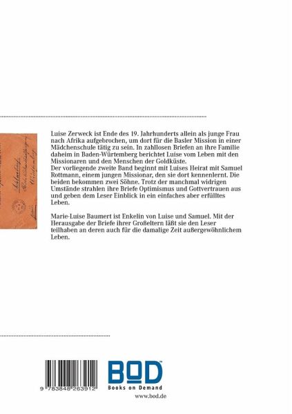 Luise Zerweck ist Ende des 19. Jahrhunderts allein als junge Frau nach Afrika aufgebrochen, um dort für die Basler Mission in einer Mädchenschule tätig zu sein. In zahllosen Briefen an ihre Familie daheim in Baden-Würtemberg berichtet Luise vom Leben mit den Missionaren und den Menschen der Goldküste.Der vorliegende zweite Band beginnt mit Luises Heirat mit Samuel Rottmann, einem jungen Missionar, den sie dort kennenlernt. Die beiden bekommen zwei Söhne. Trotz der manchmal widrigen Umstände strahlen ihre Briefe Optimismus und Gottvertrauen aus und geben dem Leser Einblick in ein einfaches aber erfülltes Leben.