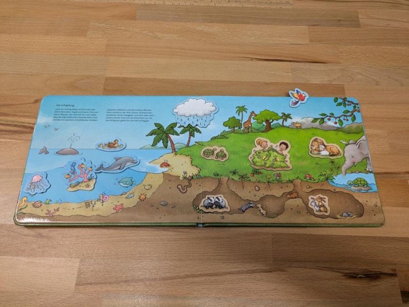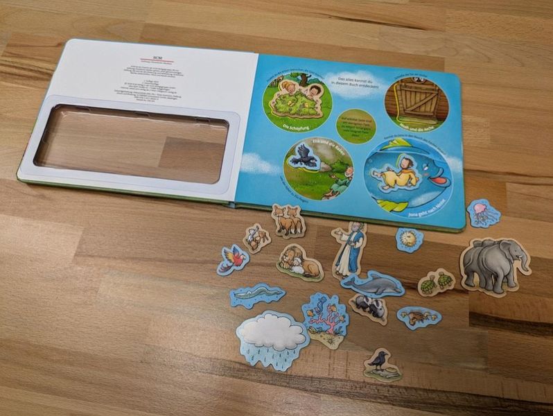 Tiergeschichten aus der Bibel mit Magneten nachspielen! Vier tolle Bibelgeschichten lassen sich auf diesen magnetischen Seiten entdecken: die Schöpfung, Noahs Arche, Elia wird von Raben versorgt, Jona und der Wal.
