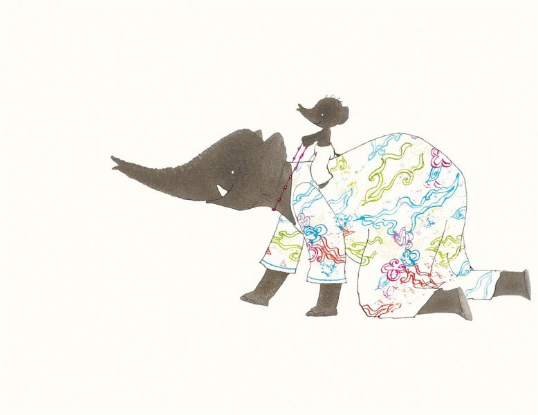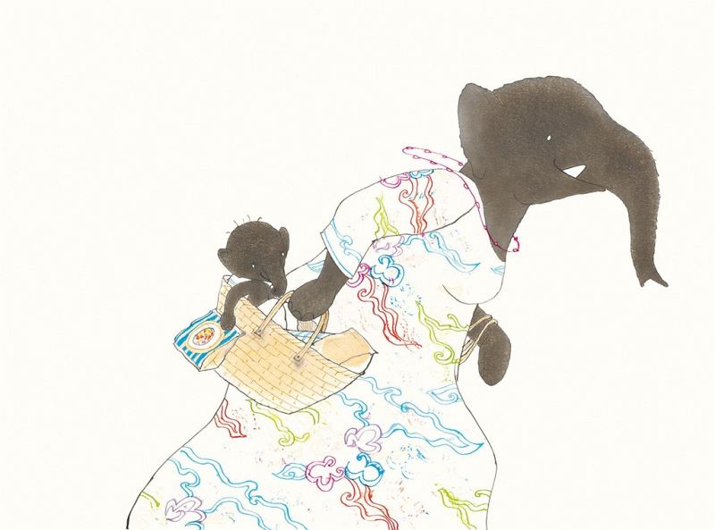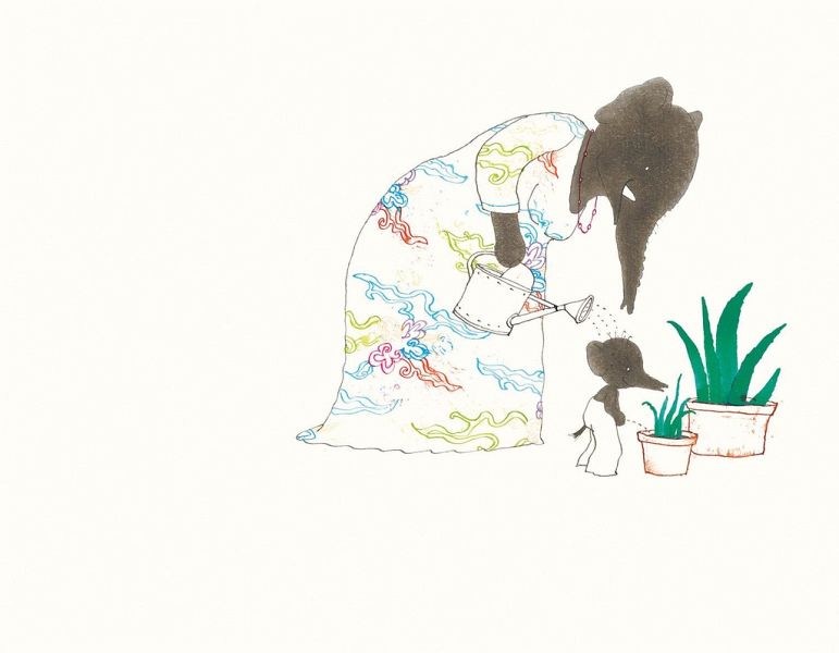 Auf dem Cover ist die Elefanten-Mama und ihr Kind zu sehen. Genauso sind auch die Illustrationen des Buches gehalten, wenig Farbe auf weißem Untergrund, ungewöhnlich für ein Kinderbuch.