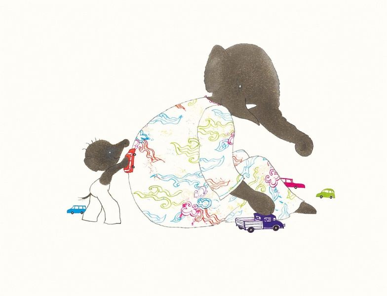 ganzes Leben.“ Die beiden spielen mit den Spielzeugautos, „Mama sieht immer schön aus.“ Aber trotzdem…mehrAuf dem Cover ist die Elefanten-Mama und ihr Kind zu sehen. Genauso sind auch die Illustrationen des Buches gehalten, wenig Farbe auf weißem Untergrund, ungewöhnlich für ein Kinderbuch.