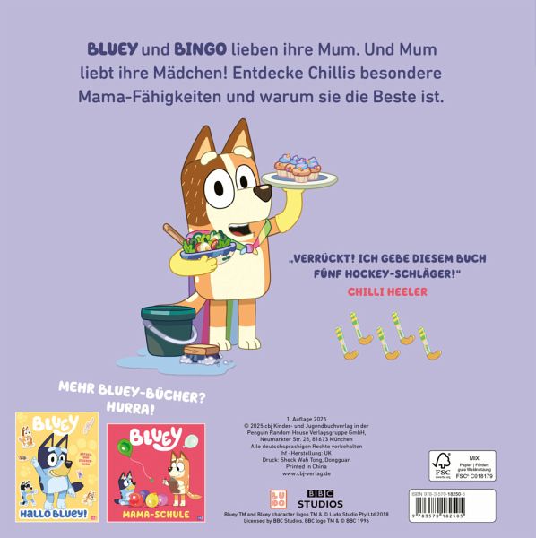 Bluey und Bingo finden, dass ihre Mum die beste Mama der Welt ist. Neben ihrem Job kümmert sich Chilli von morgens bis abends um ihre Mädchen. Sie begleitet sie auf den Spielplatz und zum Rollerfahren. Sie tröstet, muntert auf und hilft beim Lösen von Problemen. Und am Abend wird gekuschelt und vorgelesen. Bluey und Bingo lieben ihre Mum. Und ihre Mum liebt sie.