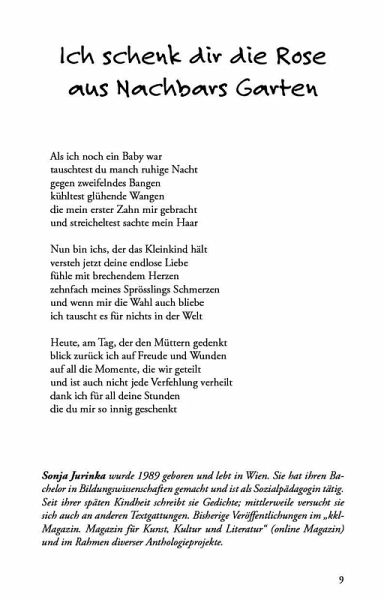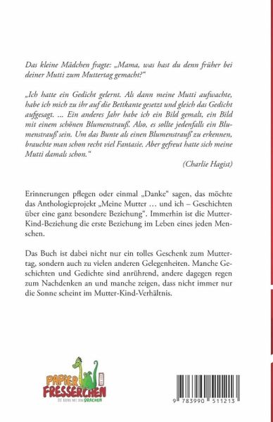 Das kleine Mädchen fragte: "Mama, was hast du denn früher bei deiner Mutti zum Muttertag gemacht?""Ich hatte ein Gedicht gelernt. Als dann meine Mutti aufwachte, habe ich mich zu ihr auf die Bettkante gesetzt und gleich das Gedicht aufgesagt. ... Ein anderes Jahr habe ich ein Bild gemalt, ein Bild mit einem schönen Blumenstrauß. Also, es sollte jedenfalls ein Blumenstrauß sein. Um das Bunte als einen Blumenstrauß zu erkennen, brauchte man schon recht viel Fantasie. Aber gefreut hatte sich meine Mutti damals schon." (Charlie Hagist)Erinnerungen pflegen oder einmal "Danke" sagen, das möchte das Anthologieprojekt "Meine Mutter ... und ich - Geschichten über eine ganz besondere Beziehung". Immerhin ist die Mutter-Kind-Beziehung die erste Beziehung im Leben eines jeden Menschen.Das Buch ist dabei nicht nur ein tolles Geschenk zu Muttertag, sondern auch zu vielen anderen Gelegenheiten. Manche Geschichten und Gedichte sind anrührend, andere dagegen regen zum Nachdenken an und manche zeigen, dass nicht immer nur die Sonne scheint im Mutter-Kind-Verhältnis.