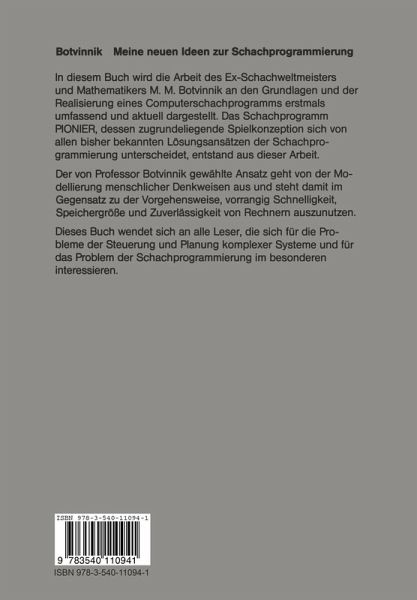 Exschachweltmeister M.M. Botwinnik stellt seine Arbeit bei der Realisierung seines Computerschachprogramms PIONIER vor. Entgegen allen bisherigen Versuchen, die Computertechnik vorrangig auszunutzen oder voranzutreiben, geht Botwinnik von der Modellierung menschlicher Denkweisen aus, die den Denkprozess eines Schachspielers simulieren sollen. Das Buch richtet sich an alle Leser, die sich für Probleme der Steuerung und Planung komplexer Systeme und speziell für das Problem der Schachprogrammierung interessieren..." (Rochade)