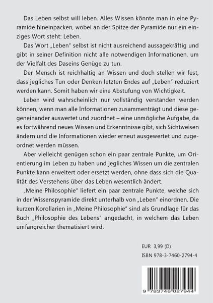 Das Leben selbst will leben. Alles Wissen könnte man in eine Pyramide hineinpacken, wobei an der Spitze der Pyramide nur ein einziges Wort steht: Leben.Das Wort "Leben" selbst ist nicht ausreichend aussagekräftig und gibt in seiner Definition nicht alle notwendigen Informationen, um der Vielfalt des Daseins Genüge zu tun.Der Mensch ist reichhaltig an Wissen und doch stellen wir fest, dass jegliches Tun oder Denken letzten Endes auf "Leben" reduziert werden kann. Somit haben wir eine Abstufung von Wichtigkeit.Leben wird wahrscheinlich nur vollständig verstanden werden können, wenn man alle Informationen zusammenträgt und diese gegeneinander auswertet und zuordnet - eine unmögliche Aufgabe, da es fortwährend neues Wissen und Erkenntnisse gibt, sich Sichtweisen ändern und die Informationen wieder erneut ausgewertet und zugeordnet werden müssen. Aber vielleicht genügen schon ein paar zentrale Punkte, um Orientierung im Leben zu haben und jegliches Wissen um die zentralen Punkte kann erweitert oder ersetzt werden, ohne dass sich die Qualität des Verstehens über das Leben wesentlich ändert."Meine Philosophie" liefert ein paar zentrale Punkte, welche sich in der Wissenspyramide direkt unterhalb von "Leben" einordnen. Die kurzen Korollarien in "Meine Philosophie" sind als Grundlage für das Buch "Philosophie des Lebens" angedacht, in welchem das Leben umfangreicher thematisiert wird.