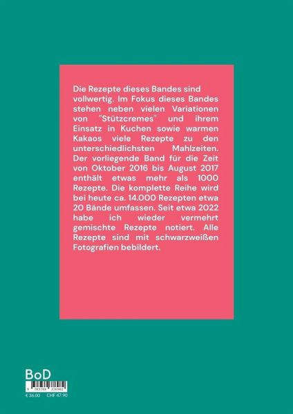 Die Rezepte dieses Bandes sind überwiegend vollwertig, nicht aber tiereiweißfrei. Im Fokus dieses Bandes stehen neben vielen Variationen von "Stützcremes" und ihrem vielfältigen Einsatz in Kuchen und Desserts viele verschiedene Mahlzeiten. Der vorliegende Band für die Zeit von Oktober 2016 bis August 2017 enthält etwas mehr als 1150 Rezepte. Die komplette Reihe wird bei heute ca. 14.000 Rezepten etwa 20 Bände umfassen. Seit etwa 2022 habe ich wieder vermehrt gemischte Rezepte notiert. Alle Rezepte sind mit schwarzweißen Fotografien bebildert.