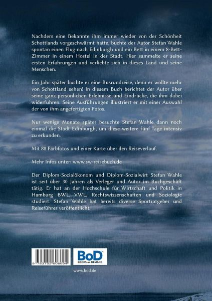 Nachdem eine Bekannte ihm immer wieder von der Schönheit Schottlands vorgeschwärmt hatte, buchte der Autor Stefan Wahle spontan einen Flug nach Edinburgh und ein Bett in einem 8-Bett-Zimmer in einem Hostel in der Stadt. Hier sammelte er seine ersten Erfahrungen und verliebte sich in dieses Land und seine Menschen.Ein Jahr später buchte er eine Busrundreise, denn er wollte mehr von Schottland sehen! In diesem Buch berichtet der Autor über seine ganz persönlichen Erlebnisse und Eindrücke, die ihm dabei widerfuhren. Seine Ausführungen illustriert er mit einer Auswahl der von ihm angefertigten Fotos.Nur wenige Monate später besuchte Stefan Wahle dann noch einmal die Stadt Edinburgh, um diese weitere fünf Tage intensiv zu erkunden. Mit 88 Farbfotos und einer Karte über den Reiseverlauf.Mehr Infos unter: www.sw-reisebuch.deDer Diplom-Sozialökonom und Diplom-Sozialwirt Stefan Wahle ist seit über 30 Jahren als Verleger und Autor im Buchgeschäft tätig. Er hat an der Hochschule für Wirtschaft und Politik in Hamburg BWL, VWL, Rechtswissenschaften und Soziologie studiert. Stefan Wahle hat bereits diverse Sportratgeber und Reiseführer veröffentlicht.