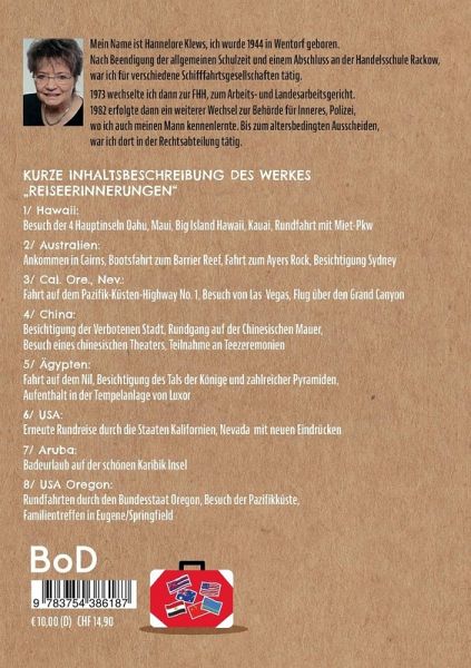 Wer denkt nicht hin und wieder wehmütig an vergangene Urlaube zurück und schaut sich alte Urlaubsfotos sehnsuchtsvoll an? Hannelore Klews war es ein Herzenswunsch, in dieser tagebuchähnlichen Retrospektive von acht wundervollen Reisen zusammen mit ihrem Mann zu erzählen. Im Mittelpunkt stehen die persönlichen Reiseerlebnisse der Autorin zu einer Zeit, als Reiseziele nur mit Straßenkarten oder per Beschilderung oder mithilfe von Prospekten gefunden wurden. Eine Zeit, als das Internet gerade in den Kinderschuhen steckte und Reisende noch nach dem Weg fragen mussten. Das reisefreudige Ehepaar hat auf seinen erlebnisreichen Touren viele Freundschaften geschlossen, die bis heute bestehen. Sie reisten unter anderem nach Hawaii, Australien, China, Ägypten, Aruba und in die USA.Ein Buch für Reisenostalgiker, die ganz persönliche Erfahrungen schätzen.