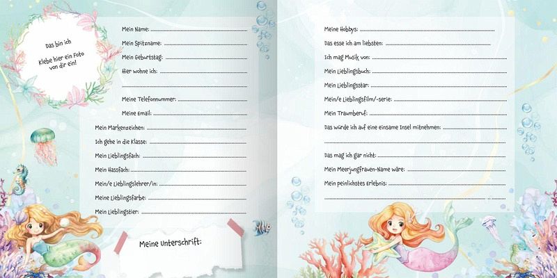 In diesem schönen Meerjungfrauen-Album können sich alle deine Schulfreundinnen und -freunde eintragen. Was machen sie in ihrer Freizeit am liebsten? Welches Schulfach mögen sie so gar nicht? Und wie würden sie als Meerjungfrau heißen? Für eine traumhaft-schöne Erinnerung an deine Klasse und eure Schulzeite.