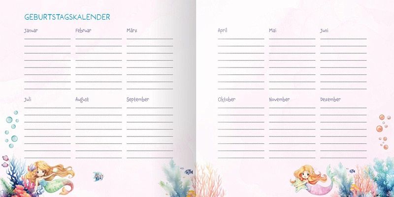 Dieses Freundebuch ist besonders schön für Mädchen, die Meerjungfrauen lieben: Über jede Seite schwimmen fröhliche Meerjungrfauen, Nixen und Meeresbewohner.
