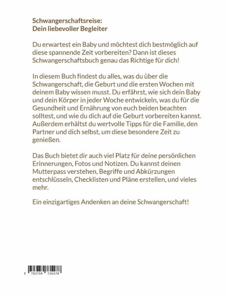Du erwartest ein Baby und möchtest dich bestmöglich auf diese spannende Zeit vorbereiten? Dann ist dieses Schwangerschaftsbuch genau das Richtige für dich!In diesem Buch findest du alles, was du über die Schwangerschaft, die Geburt und die ersten Wochen mit deinem Baby wissen musst. Du erfährst, wie sich dein Baby und dein Körper in jeder Woche entwickeln, was du für die Gesundheit und Ernährung von euch beiden beachten solltest, und wie du dich auf die Geburt vorbereiten kannst. Außerdem erhältst du wertvolle Tipps für die Familie, den Partner und dich selbst, um diese besondere Zeit zu genießen.Das Buch bietet dir auch viel Platz für deine persönlichen Erinnerungen, Fotos und Notizen. Du kannst deinen Mutterpass verstehen, Begriffe und Abkürzungen entschlüsseln, Checklisten und Pläne erstellen, und vieles mehr. So hast du am Ende ein einzigartiges Andenken an deine Schwangerschaft.