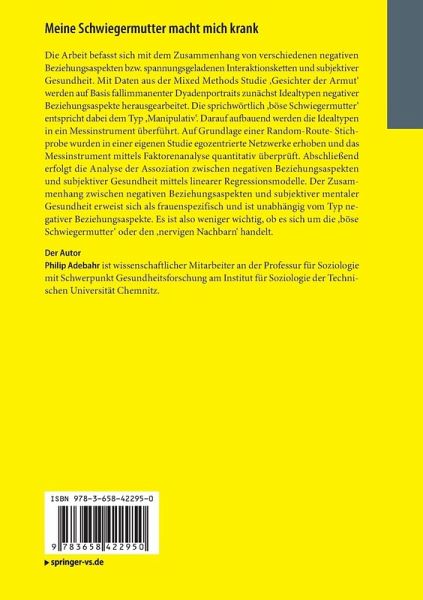 Die Arbeit befasst sich mit dem Zusammenhang von verschiedenen negativen Beziehungsaspekten bzw. spannungsgeladenen Interaktionsketten und subjektiver Gesundheit. Mit Daten aus der Mixed Methods Studie 'Gesichter der Armut' werden auf Basis fallimmanenter Dyadenportraits zunächst Idealtypen negativer Beziehungsaspekte herausgearbeitet. Die sprichwörtlich 'böse Schwiegermutter' entspricht dabei dem Typ 'Manipulativ'. Darauf aufbauend werden die Idealtypen in ein Messinstrument überführt. Auf Grundlage einer Random-Route-Stichprobe wurden in einer eigenen Studie egozentrierte Netzwerke erhoben und das Messinstrument mittels Faktorenanalyse quantitativ überprüft. Abschließend erfolgt die Analyse der Assoziation zwischen negativen Beziehungsaspekten und subjektiver Gesundheit mittels linearer Regressionsmodelle. Der Zusammenhang zwischen negativen Beziehungsaspekten und subjektiver mentaler Gesundheit erweist sich als frauenspezifisch und ist unabhängig vom Typ negativer Beziehungsaspekte.Es ist also weniger wichtig, ob es sich um die 'böse Schwiegermutter' oder den 'nervigen Nachbarn' handelt.