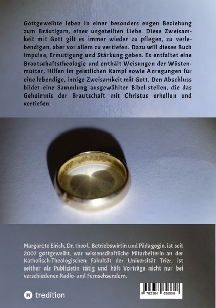 Gottgeweihte leben in einer besonders engen Beziehung zum Bräutigam, einer ungeteilten Liebe. Diese Zweisamkeit mit Gott gilt es immer wieder zu pflegen, zu verlebendigen, aber vor allem zu vertiefen. Dazu will dieses Buch Impulse, Ermutigung und Stärkung geben. Es entfaltet eine Brautschaftstheologie und enthält Weisungen der Wüstenmütter, Hilfen im geistlichen Kampf sowie Anregungen für eine lebendige, innige Zweisamkeit mit Gott. Den Abschluss bildet eine Sammlung ausgewählter Bibelstellen, die das Geheimnis der Brautschaft mit Christus erhellen und vertiefen.