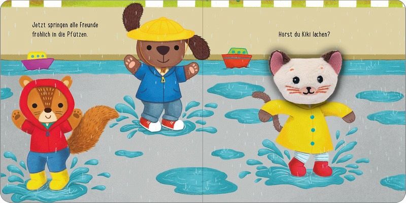 Kiki, die kleine Katze, liebt Regenwetter. Wenn am Himmel dunkle Wolken aufziehen, zieht sie schnell ihre Gummistiefel an. Begleite Kiki nach draußen und hüpfe mit ihr in die größten Pfützen. Sagt gemeinsam den Regenwürmern hallo und lasse zusammen mit Kikis Freunden Boote den Rinnstein herunterfahren. Hörst du Kiki frech kichern? Was für ein Spaß!
