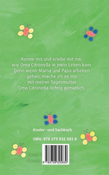 Ein wundervolles Buch für kleine Kinder (bis 4 Jahre).Ein Buch voller Liebe und Freude mit und für kleine Kinder - geschrieben in kindgerechter Sprache, lustig illustriert und einfach erfrischend. Die Kids werden es lieben und wir Erwachsene auch.Oma Citronella ist eine Tagesmutter und begleitet ihre Tageskinder mit viel Liebe durch den Tag. Es wird gebacken, gebastelt, gemalt, gesungen und jede Menge Quatsch gemacht - ein Buch zum Vorlesen für kleine Kinder bis 4 Jahre.Es wird in kindgerechter Sprache Achtsamkeit für unsere Welt vermittelt. Geschichten, die kleine Kinder stark machen - die Natur, die Liebe und das Vertrauen in das Leben sind dabei der Kern der Erzählungen. Mit Oma Citronella werden die Kinder wach für das Schöne in und um sie - ein Buch voller Herzenswärme.