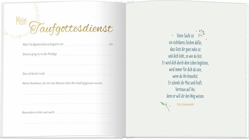 Der Taufspruch, das schönste Lied im Gottesdienst, liebe Wünsche der Gäste - zahlreiche Eintrageseiten laden dazu ein, alles Wichtige rund um das Tauffest niederzuschreiben. Außerdem gibt es reichlich Platz für die schönsten Fotos. Ergänzt wird das Album durch ausgewählte Bibelzitate, gute Gedanken und Segensgebete. Auch die christlichen Symbole wie Taube, Kreuz, Fisch, Anker und Regenbogen werden mit einer persönlichen Botschaft aufgegriffen. Diese liebevollen Worte können das Taufkind auch noch langenach der Taufe auf dem Lebensweg begleiten.