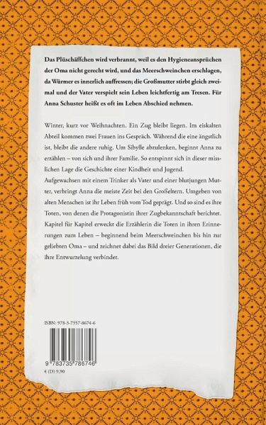 Das Plüschäffchen wird verbrannt, weil es nicht den Hygieneansprüchen der Oma gerecht wird, und das Meerschweinchen erschlagen, da Würmer es innerlich auffressen; die Großmutter stirbt gleich zweimal und der Vater verspielt sein Leben leichtfertig am Tresen. Für Anna Schuster heißt es oft im Leben Abschied nehmen.Winter, kurz vor Weihnachten. Ein Zug bleibt liegen. Im eiskalten Abteil kommen zwei Frauen ins Gespräch. Während die eine ängstlich ist, bleibt die andere ruhig. Um Sibylle abzulenken, beginnt Anna zu erzählen - von sich und ihrer Familie. So entspinnt sich in dieser misslichen Lage die Geschichte einer Kindheit und Jugend.Aufgewachsen mit einem Trinker als Vater und einer blutjungen Mutter, verbringt Anna die meiste Zeit bei den Großeltern. Umgeben von alten Menschen ist ihr Leben früh vom Tod geprägt. Und so sind es ihre Toten, von denen die Protagonistin ihrer Zugbekanntsschaft berichtet.Kapitel für Kapitel erweckt die Erzählerin die Toten in ihren Erinnerungen zum Leben - beginnend beim Meerschweinchen bis hin zur geliebten Oma - und zeichnet dabei auch das Bild dreier Generationen, die ihre Entwurzelung verbindet.