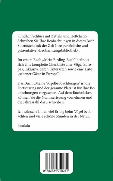 »Endlich Schluss mit Zetteln und Heftchen!« Schreiben Sie Ihre Beobachtungen in dieses Buch. So entsteht mit der Zeit Ihre persönliche und präsentative »Beobachtungsbibliothek«.Im ersten Buch "Mein Birding-Buch" befindet sich eine komplette Checkliste aller Vögel Europas, inklusive deren Unterarten sowie eine Liste "seltener Gäste in Europa".Das Buch "Meine Vogelbeobachtungen" ist die Fortsetzung und der gesamte Platz ist für Ihre Beobachtungen vorgesehen. Auf dem Buchrücken können Sie die Nummerierung vornehmen und die Jahreszahl dazu schreiben.Ich wünsche Ihnen viel Erfolg beim Vögel beobachten und viele schöne Stunden in der Natur.fotolulu
