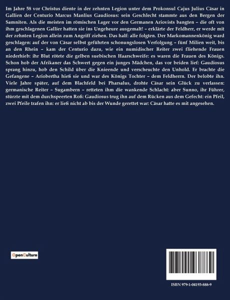 Im Jahre 58 vor Christus diente in der zehnten Legion unter dem Prokonsul Cajus Julius Cäsar in Gallien der Centurio Marcus Manlius Gaudiosus: sein Geschlecht stammte aus den Bergen der Samniten. Als die meisten im römischen Lager vor den Germanen Ariovists bangten ¿ die oft von ihm geschlagenen Gallier hatten sie ins Ungeheure ausgemalt! ¿ erklärte der Feldherr, er werde mit der zehnten Legion allein zum Angriff ziehen. Das half: alle folgten. Der Markomannenkönig ward geschlagen: auf der von Cäsar selbst geführten schonungslosen Verfolgung ¿ fünf Milien weit, bis an den Rhein ¿ kam der Centurio dazu, wie ein numidischer Reiter zwei fliehende Frauen niederhieb: ihr Blut rötete die gelben suebischen Haarschweife: es waren die Frauen des Königs. Schon hob der Afrikaner das Schwert gegen ein junges Mädchen, das vor beiden lief: Gaudiosus sprang hinzu, hob den Schild über die Knieende und verscheuchte den Unhold. Er brachte die Gefangene ¿ Ariobertha hieß sie und war des Königs Tochter ¿ dem Feldherrn. Der belobte ihn. Viele Jahre später, auf dem Blachfeld bei Pharsalus, drohte Cäsar sein Glück zu verlassen: germanische Reiter ¿ Sugambern ¿ retteten ihm die wankende Schlacht: aber Sunno, ihr Führer, stürzte mit dem durchspeerten Roß: Gaudiosus trug ihn auf dem Rücken aus dem Gefecht: ein Pfeil, zwei Pfeile trafen ihn: er ließ nicht ab bis der Wunde gerettet war: Cäsar hatte es mit angesehen.