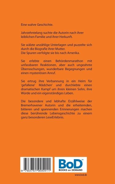 Jahrzehntelang suchte die Autorin nach ihrer leiblichen Familie, nach ihrer Herkunft.Mit geradezu detektivischem Gespür führte sie diese zermürbende Suche bis nach Amerika.Trotz unzähliger Sperrvermerke in ihren Akten puzzelte sie sich durch die Lebensgeschichte ihrer Mutter und entdeckte dabei ihre Brüder, einen sogar ganz in ihrer Nähe.Sie erlebte einen Behördenmarathon mit unfassbaren Ereignissen, aber auch ungeahnte Überraschungen, wunderbare Begegnungen und einen mysteriösen Anruf, Sie ertrug sie ihre Verbannung in ein Heim für 'gefallene' Mädchen und durchlebte einen dramatischen Kampf um ihren kleinen Sohn, um ihre Würde und ein eigenständiges Leben. Die besondere und lebhafte Erzählweise der Bremerhavener Autorin und die erheiternden, bitteren und spannenden Erinnerungen machen diese berührende Lebensgeschichte zu einem ganz besonderen LeseErlebnis.