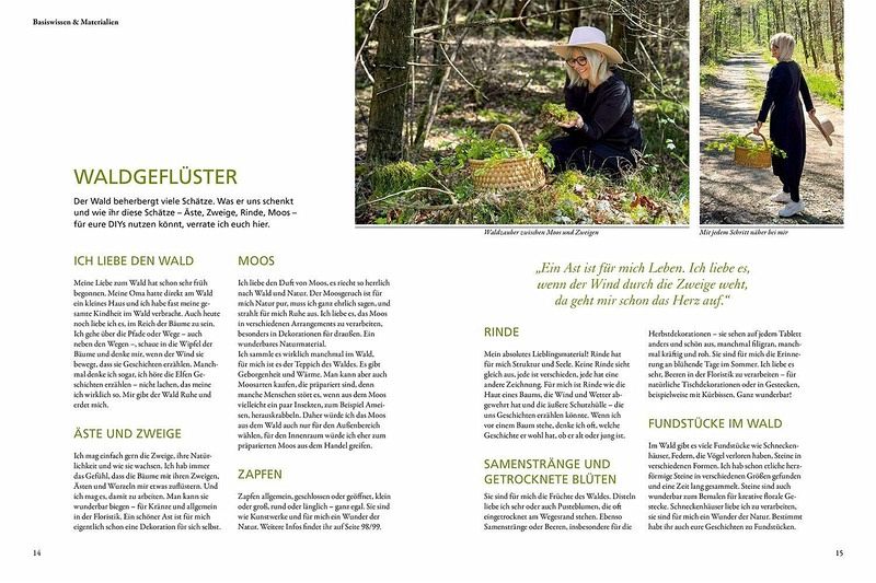 Neben einer Doppelseite mit den häufigsten Fragen aus ihrer Community (von Motivation über Materialquellen bis hin zu ganz Alltäglichem) findet man im „Basiswissen“ wertvolle Tipps zu Werkzeug, Materialien aus der Natur und deren Verarbeitung. Waldl zeigt, wie viel Zauber in Blüten, Rinde, Holz, Glas und selbst alten Alltagsgegenständen steckt. Upcycling spielt dabei ebenfalls eine Rolle. Alles wird mit wenigen Handgriffen in eine zauberhafte Dekoration verwandelt. Besonders charmant sind die kleinen Elfenfiguren aus Blüten und Holzkugeln, die für eine märchenhafte Stimmung sorgen.