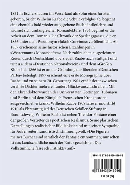 1831 in Eschershausen im Weserland als Sohn eines Juristen geboren, bricht Wilhelm Raabe die Schule erfolglos ab, beginnt eine ebenfalls bald wieder aufgegebene Buchhändlerlehre und widmet sich umfangreicher Romanlektüre. 1854 beginnt er die Arbeit an dem Roman "Die Chronik der Sperlingsgasse", die er 1856 unter dem Pseudonym "Jakob Corvinus" veröffentlicht. Ab 1857 erscheinen seine historischen Erzählungen in "Westermanns Monatsheften". Nach zahlreichen ausgedehnten Reisen durch Deutschland übersiedelt Raabe nach Stuttgart und tritt u.a. dem "Deutschen Nationalverein" und dem "Großen Klub" bei. 1866 ist er an der Gründung der liberalen "Deutschen Partei" beteiligt. 1897 erscheint eine erste Monographie über Raabe und zu seinem 70. Geburtstag 1901 erhält der inzwischen verehrte Dichter mehrere hundert Glückwunschschreiben. Mit den Ehrendoktorwürden der Universitäten Göttingen, Tübingen und Berlin und dem Königlich Preußischen Kronenorden ausgezeichnet, erkrankt Wilhelm Raabe 1909 schwer und stirbt 1910 als Ehrenmitglied der Deutschen Schiller-Stiftung in Braunschweig. Wilhelm Raabe ist neben Theodor Fontane einer der großen Vertreter des poetischen Realismus. Seine plastischen Darstellungen realistischer Bildlichkeit sind mit seiner Sympathie für Außenseiter humoristisch stimmungsvoll. "Die Figuren meiner Bücher sind sämtlich der Fantasie entnommen; nur selten ist das Landschaftliche nach der Natur gezeichnet. Das Volkstümliche fasse ich instinktiv auf."