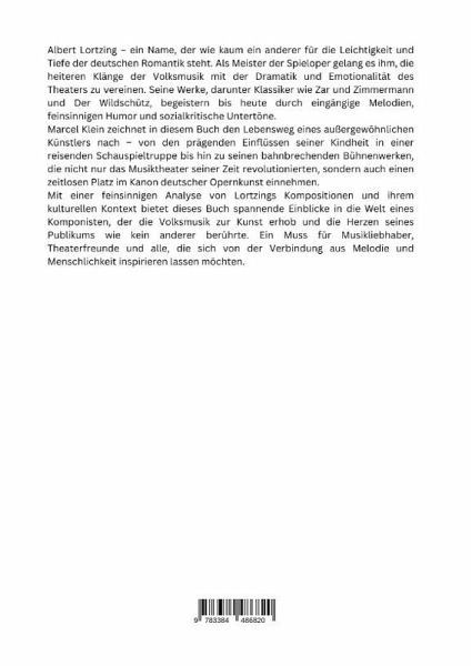Albert Lortzing - ein Name, der wie kaum ein anderer für die Leichtigkeit und Tiefe der deutschen Romantik steht. Als Meister der Spieloper gelang es ihm, die heiteren Klänge der Volksmusik mit der Dramatik und Emotionalität des Theaters zu vereinen. Seine Werke, darunter Klassiker wie Zar und Zimmermann und Der Wildschütz, begeistern bis heute durch eingängige Melodien, feinsinnigen Humor und sozialkritische Untertöne.Marcel Klein zeichnet in diesem Buch den Lebensweg eines außergewöhnlichen Künstlers nach - von den prägenden Einflüssen seiner Kindheit in einer reisenden Schauspieltruppe bis hin zu seinen bahnbrechenden Bühnenwerken, die nicht nur das Musiktheater seiner Zeit revolutionierten, sondern auch einen zeitlosen Platz im Kanon deutscher Opernkunst einnehmen.Mit einer feinsinnigen Analyse von Lortzings Kompositionen und ihrem kulturellen Kontext bietet dieses Buch spannende Einblicke in die Welt eines Komponisten, der die Volksmusik zur Kunst erhob und die Herzen seinesPublikums wie kein anderer berührte. Ein Muss für Musikliebhaber, Theaterfreunde und alle, die sich von der Verbindung aus Melodie und Menschlichkeit inspirieren lassen möchten.