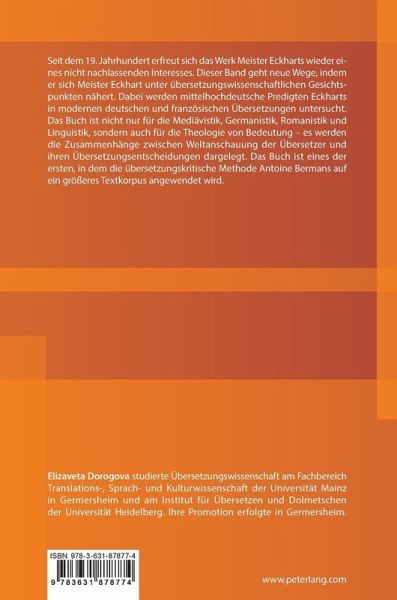 Seit dem 19. Jahrhundert erfreut sich das Werk Meister Eckharts wieder eines nicht nachlassenden Interesses. Dieser Band geht neue Wege, indem er sich Meister Eckhart unter übersetzungswissenschaftlichen Gesichtspunkten nähert. Dabei werden mittelhochdeutsche Predigten Eckharts in modernen deutschen und französischen Übersetzungen untersucht. Das Buch ist nicht nur für die Mediävistik, Germanistik, Romanistik und Linguistik, sondern auch für die Theologie von Bedeutung - es werden die Zusammenhänge zwischen Weltanschauung der Übersetzer und ihren Übersetzungsentscheidungen dargelegt. Das Buch ist eines der ersten, in dem die übersetzungskritische Methode Antoine Bermans auf ein größeres Textkorpus angewendet wird.