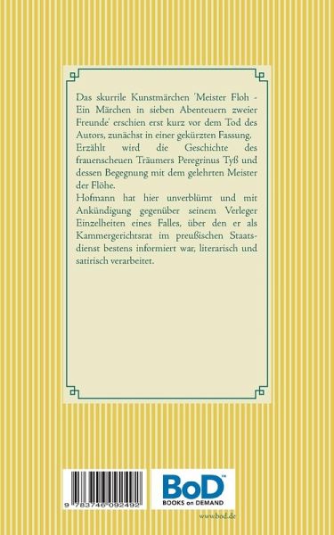 Das skurrile Kunstmärchen 'Meister Floh - Ein Märchen in sieben Abenteuern zweier Freunde' erschien erst kurz vor dem Tod des Autors, zunächst in einer gekürzten Fassung. Erzählt wird die Geschichte des frauenscheuen Träumers Peregrinus Tyß und dessen Begegnung mit dem gelehrten Meister der Flöhe.Hofmann hat hier unverblümt und mit Ankündigung gegenüber seinem Verleger Einzelheiten eines Falles, über den er als Kammergerichtsrat im preußischen Staatsdienst bestens informiert war, literarisch und satirisch verarbeitet.
