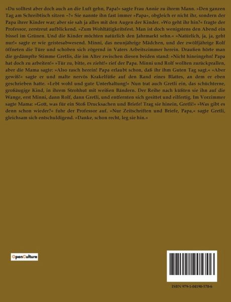 »Du solltest aber doch auch an die Luft gehn, Papa!« sagte Frau Annie zu ihrem Mann. »Den ganzen Tag am Schreibtisch sitzen ¿?« Sie nannte ihn fast immer »Papa«, obgleich er nicht ihr, sondern der Papa ihrer Kinder war; aber sie sah ja alles mit den Augen der Kinder. »Wo geht ihr hin?« fragte der Professor, zerstreut aufblickend. »Zum Wohltätigkeitsfest. Man ist doch wenigstens den Abend ein bissel im Grünen. Und die Kinder möchten natürlich den Jahrmarkt sehn.« »Natürlich, ja, ja, geht nur!« sagte er wie geistesabwesend. Minni, das neunjährige Mädchen, und der zwölfjährige Rolf öffneten die Türe und schoben sich zögernd in Vaters Arbeitszimmer herein. Draußen hörte man die gedämpfte Stimme Gretlis, die im Alter zwischen diesen beiden stand: »Nicht hineingehn! Papa hat doch zu arbeiten!« »Tür zu, bitte, es zieht!« rief der Papa. Minni und Rolf wollten zurückprallen, aber die Mama sagte: »Also rasch herein! Papa erlaubt schon, daß ihr ihm Guten Tag sagt.« »Aber gewiß!« sagte er und malte nervös Krakelfüße auf den Rand eines Blattes, an dem er eben geschrieben hatte. »Lebt wohl und gute Unterhaltung!« Nun trat auch Gretli ein, das schüchterne, großäugige Kind, in ihrem Strohhut mit weißen Bändern. Der Reihe nach küßten sie ihn auf die Wange, erst Minni, dann Rolf, dann Gretli, und entfernten sich gesittet und eilfertig. Im Vorzimmer sagte Mama: »Gott, was für ein Stoß Drucksachen und Briefe! Trag sie hinein, Gretli!« »Was gibt es denn schon wieder?« fuhr der Professor auf. »Nur Zeitschriften und Briefe, Papa,« sagte Gretli, gleichsam sich entschuldigend. »Danke, schon recht, leg sie hin.«
