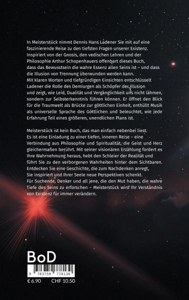 In Meisterstück nimmt Dennis Hans Ladener Sie mit auf eine faszinierende Reise zu den tiefsten Fragen unserer Existenz. Inspiriert von der Gnosis, den vedischen Lehren und der Philosophie Arthur Schopenhauers offenbart dieses Buch, dass das Bewusstsein die wahre Essenz allen Seins ist - und dass die Illusion von Trennung überwunden werden kann. Mit klaren Worten und tiefgründigen Einsichten entschlüsselt Ladener die Rolle des Demiurgen als Schöpfer der Illusion und zeigt, wie Leid, Dualität und Vergänglichkeit uns nicht lähmen, sondern zur Selbsterkenntnis führen können. Er öffnet den Blick für die Traumwelt als Brücke zur göttlichen Einheit, enthüllt Musik als universelle Sprache des Göttlichen und beleuchtet, wie jede Erfahrung Teil eines größeren, unendlichen Plans ist. Meisterstück ist kein Buch, das man einfach nebenbei liest. Es ist eine Einladung zu einer tiefen, inneren Reise - eine Verbindung aus Philosophie und Spiritualität, die Geist und Herz gleichermaßen berührt. Mit seiner visionären Erzählung fordert es Ihre Wahrnehmung heraus, hebt den Schleier der Realität und führt Sie zu den verborgenen Wahrheiten hinter dem Sichtbaren. Entdecken Sie eine Geschichte, die zum Nachdenken anregt, Sie inspiriert und Ihrer Seele neue Perspektiven schenkt. Für Suchende, Denker und all jene, die den Mut haben, die wahre Tiefe des Seins zu erforschen - Meisterstück wird Ihr Verständnis von Existenz für immer verändern.