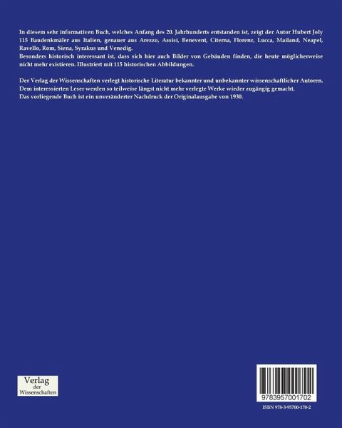In diesem sehr informativen Buch, welches Anfang des 20. Jahrhunderts entstanden ist, zeigt der Autor Hubert Joly 115 Baudenkmäler aus Italien, genauer aus Arezzo, Assisi, Benevent, Citerna, Florenz, Lucca, Mailand, Neapel, Ravello, Rom, Siena, Syrakus und Venedig.