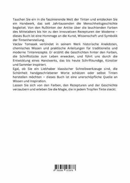 Tauchen Sie ein in die faszinierende Welt der Tinten und entdecken Sie ein Handwerk, das seit Jahrtausenden die Menschheitsgeschichte begleitet. Von den Rußtinten der Antike über die leuchtenden Farben des Mittelalters bis hin zu den innovativen Rezepturen der Moderne - dieses Buch ist eine Hommage an die Kunst, Wissenschaft und Symbolik der Tintenherstellung.Vaclav Tomasek verbindet in seinem Werk historische Anekdoten, chemisches Wissen und praktische Anleitungen für traditionelle und moderne Tintenrezepte. Er erzählt die Geschichten hinter den Farben, die Schriftstücke zum Leben erwecken, und führt uns durch die Entwicklung eines Handwerks, das bis heute Schriftkundige, Künstler und Sammler inspiriert.Egal, ob Sie ein Liebhaber klassischer Schreibwerkzeuge sind, die Schönheit handgeschriebener Worte schätzen oder selbst Tinten herstellen möchten - dieses Buch ist eine unerschöpfliche Quelle an Wissen und Inspiration.Lassen Sie sich von den Farben, den Rezepturen und der Geschichte verzaubern und er-leben Sie die Magie, die in jedem Tropfen Tinte steckt.