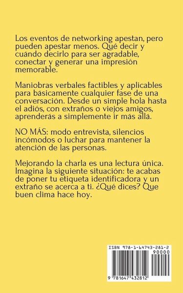 Los eventos de networking apestan, pero pueden apestar menos. Qué decir y cuándo decirlo para ser agradable, conectar y generar una impresión memorable. Maniobras verbales factibles y aplicables para básicamente cualquier fase de una conversación. Desde un simple hola hasta el adiós, con extraños o viejos amigos, aprenderás a simplemente ir más allá. NO MÁS: modo entrevista, silencios incómodos o luchar para mantener la atención de las personas. Mejorando la charla es una lectura única. Imagina la siguiente situación: te acabas de poner tu etiqueta identificadora y un extraño se acerca a ti. ¿Qué dices? Que buen clima hace hoy. No, podemos hacerlo mejor que eso. Desarrolla una mejor charla para evitar la incomodidad, poner a gusto a las personas y crear una buena relación. Patrick King es un autor con superventas a nivel internacional y entrenador de habilidades sociales. Sus obras provienen de fuentes, desde investigaciones científicas, experiencia académica, entrenamiento y experiencia en la vida real. Sufrió por años como una persona tímida e introvertida y logró reducir la interacción humana a la ciencia; primero para él y ahora para ti. Aprenderás diálogos exactos, respuestas, frases y preguntas que puedes usar. ¿Cómo contar historias cautivadoras y en qué enfocarse. ¿Cuatro maneras de calentar y prepararte para las conversaciones más impredecibles. ¿Establecer el tono de la amistad y la franqueza con extraños de manera instantánea. ¿Hábitos comunes y sutiles que tienes que dejar ya mismo.