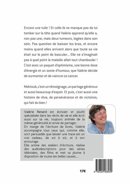 Encore une tuile! Celle-là ne manque pas de lui tomber sur la tête quand Valérie apprend qu'elle a, non pas une, mais deux tumeurs logées dans son sein. Elle ne s'imaginait pas à quel point la maladie allait tout chambouler. Et c'est avec un paquet d'optimisme, une bonne dose d'énergie et un zeste d'humour que Valérie décide de raconter cette "aventure".Mektoub, c'est un témoignage, un partage généreux, émouvant et aussi beaucoup d'espoir. C'est aussi une histoire de rêve qui se réalise et de persévérance qui fait du bien.