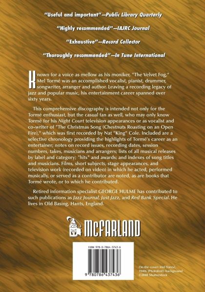 Known for a voice as mellow as his moniker, ""The Velvet Fog,"" Mel Torme was an accomplished vocalist, pianist, drummer, songwriter, arranger and author. Leaving a recording legacy of jazz and popular music, his death in June 1999 ended an entertainment career spanning over sixty years. This comprehensive discography is intended not only for the Torme enthusiast, but the casual fan as well, who may only know Torme for his Night Court television appearances or as vocalist and co-writer of ""The Christmas Song (Chestnuts Roasting on an Open Fire),"" which was first recorded by Nat ""King"" Cole. Included are a selective chronology providing the highlights of Torme's career as an entertainer; notes on record issues, recording dates, session numbers, takes, musicians and arrangers; lists of all musical releases by label and category; ""hits"" and awards; and indexes of song titles and musicians. Films, short subjects, stage appearances, and television work (recorded on video) in which he acted, performed musically, or served as a contributor are noted, as are books that Torme wrote, or to which he contributed.