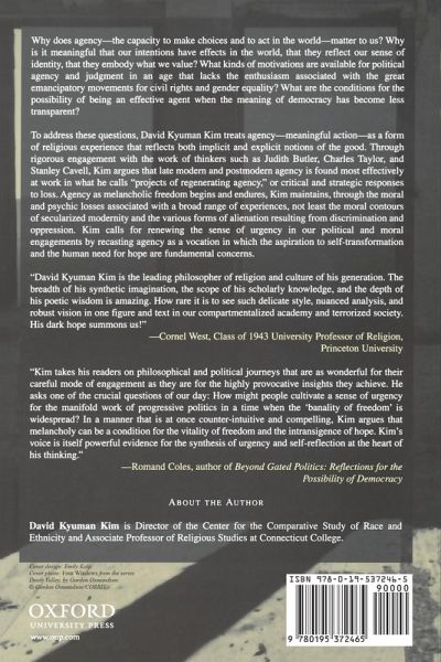 Why does agency-the capacity to make choices and to act in the world-matter to us? Why is it meaningful that our intentions have effects in the world, that they reflect our sense of identity, that they embody what we value? What kinds of motivations are available for political agency and judgment in an age that lacks the enthusiasm associated with the great emancipatory movements for civil rights and gender equality? What are the conditions for the possibility of being an effective agent when the meaning of democracy has become less transparent? David Kyuman Kim addresses these crucial questions by uncovering the political, moral, philosophical, and religious dimensions of human agency. Kim treats agency as a form of religious experience that reflects implicit and explicit notions of the good. Of particular concern are the moral, political, and religious motivations that underpin an understanding of agency as meaningful action. Through a critical engagement with the work of theorists such as Judith Butler, Charles Taylor, and Stanley Cavell, Kim argues that late modern and postmodern agency is found most effectively at work in what he calls "projects of regenerating agency" or critical and strategic responses to loss. Agency as melancholic freedom begins and endures, Kim maintains, through the moral and psychic losses associated with a broad range of experiences, including the moral identities shaped by secularized modernity and the multifold forms of alienation experienced by those who suffer the indignities of racial, gender, class, and sexuality discrimination and oppression. Kim calls for renewing the sense of urgency in our political and moral engagements by seeing agency as a vocation, where the aspiration for self-transformation and the human need for hope are fundamental concerns.