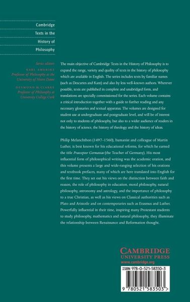 Philip Melanchthon (1497-1560), humanist and colleague of Martin Luther, is best known for his educational reforms, for which he earned the title Praeceptor Germaniae (the Teacher of Germany). His most influential form of philosophical writing was the academic oration, and this volume, first published in 1999, presents a large and wide-ranging selection of his orations and textbook prefaces translated into English. They set out his views on the distinction between faith and reason, the role of philosophy in education, moral philosophy, natural philosophy, astronomy and astrology, and the importance of philosophy to a true Christian, as well as his views on Classical philosophical authorities such as Plato and Aristotle and on contemporaries such as Erasmus and Luther. Powerfully influential in their time, inspiring many Protestant students to study philosophy, mathematics and natural philosophy, they illuminate the relationship between Renaissance and Reformation thought.