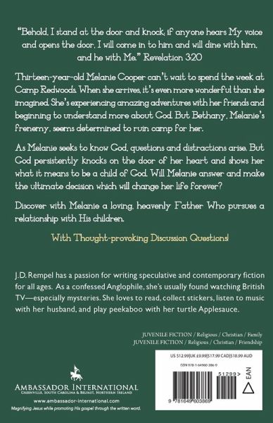 "Behold, I stand at the door and knock; if anyone hears My voice and opens the door, I will come in to him and will dine with him, and he with Me." Revelation 3:20 Thirteen-year-old Melanie Cooper can't wait to spend the week at Camp Redwoods. When she arrives, it's even more wonderful than she imagined. She's experiencing amazing adventures with her friends and beginning to understand more about God. But Bethany, Melanie's frenemy, seems determined to ruin camp for her. As Melanie seeks to know God, questions and distractions arise. But God persistently knocks on the door of her heart and shows her what it means to be a child of God. Will Melanie answer and make the ultimate decision which will change her life forever? Discover with Melanie a loving, heavenly Father Who pursues a relationship with His children.