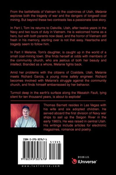 From the battlefields of Vietnam to the coalmines of Utah, Melanie explores both the tragedy of war and the dangers of longwall coal mining. But beyond these two contrasts lies a passionate love story. In Part I, Tom Ire returns to Oakville, Utah, after twelve years in the Navy and two tours of duty in Vietnam. He is welcomed home as a hero, but with both parents now dead, and the horror of Vietnam still fresh in his memory, starting over is not that easy. Heartache and tragedy seem to follow him. In Part II Melanie, Tom's daughter, is caught up in the world of a small coal-mining town. She finds herself at odds with members of the community church, who are jealous of both her beauty and intellect. Branded as a whore, Melanie fights back. Amid her problems with the citizens of Coaldale, Utah, Melanie meets Richard Garcia, a young mine safety engineer. Richard becomes involved with Melanie's struggle against the community church, and finds himself embarrassed by her behavior. Turmoil deep in the earth's surface along the Wasatch Fault, lying silent for ten thousand years, is about to explode!