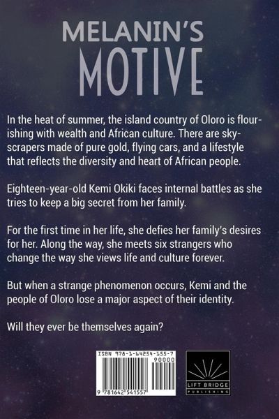 In the heat of summer, the island country of Oloro is flourishing with wealth and African culture. There are skyscrapers made of pure gold, flying cars, and a lifestyle that reflects the diversity and heart of African people. Eighteen-year-old Kemi Okiki faces internal battles as she tries to keep a big secret from her family. For the first time in her life, she defies her family's desires for her. Along the way, she meets six strangers who change the way she views life and culture forever. But when a strange phenomenon occurs, Kemi and the people of Oloro lose a major aspect of their identity. Will they ever be themselves again?