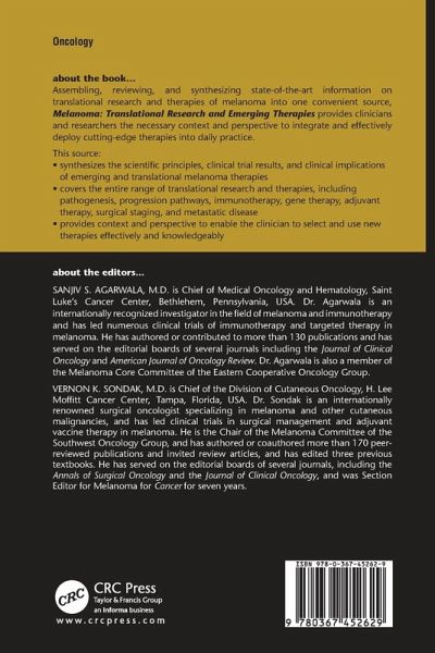 SANJIV S. AGARWALA, M.D. is Chief of Medical Oncology and Hematology, Saint Luke's Cancer Center, Bethlehem, Pennsylvania, USA. Dr. Agarwala is an internationally recognized investigator in the field of melanoma and immunotherapy and has led numerous clinical trials of immunotherapy and targeted therapy in melanoma. He has authored or contributed to more than 130 publications and has served on the editorial boards of several journals including the Journal of Clinical Oncology and American Journal of Oncology Review. Dr. Agarwala is also a member of the Melanoma Core Committee of the Eastern Cooperative Oncology Group. VERNON K. SONDAK, M.D. is Chief of the Division of Cutaneous Oncology, H. Lee Moffitt Cancer Center, Tampa, Florida, USA. Dr. Sondak is an internationally renowned surgical oncologist specializing in melanoma and other cutaneous malignancies, and has led clinical trials in surgical management and adjuvant vaccine therapy in melanoma. He is the Chair of the Melanoma Committee of the Southwest Oncology Group, and has authored or coauthored more than 170 peer-reviewed publications and invited review articles, and has edited three previous textbooks. He has served on the editorial boards of several journals, including the Annals of Surgical Oncology and the Journal of Clinical Oncology, and was Section Editor for Melanoma for Cancer for seven years.