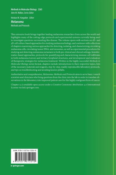 Model Systems for the Study of Malignant Melanoma.- Generation of Functional Gene Knockout Melanoma Cell Lines by CRISPR-Cas9 Gene Editing.- A Fluorescent Gelatin Degradation Assay to Study Melanoma Breakdown of Extracellular Matrix.- Wound Healing Assay for Melanoma Cell Migration.- A Fluorescence-Based Assay for Measuring Glucose Uptake in Living Melanoma Cells.- Analyzing Melanoma Cell Oxygen Consumption and Extracellular Acidification Rates Using Seahorse Technology.- Analysis of Melanoma Cell Glutamine Metabolism by Stable Isotope Tracing and Gas Chromatography-Mass Spectrometry.- Determination of Cytotoxic Activities Against Melanoma Cells Using Flow Cytometry.- In Vitro Differentiation of Tumor-Associated Macrophages from Monocyte Precursors with Modified Melanoma-Conditioned Medium.- A Flow Cytometric Assay for Investigating Melanoma Cell Adhesion to Lymphatic Endothelial Cells.- An Approach to Study Melanoma Invasion and Crosstalk with Lymphatic Endothelial Cell Spheroids in 3D Using Immunofluorescence.- Evaluating Melanoma Viability and Proliferation in 3D Microenvironments.- Preparation, Drug Treatment, and Immunohistological Analysis of Tri-Culture Spheroid 3D Melanoma-Like Models.- Enrichment of Melanoma Cancer Stem Cells via Sphere Assays.- Capture and Isolation of Circulating Melanoma Cells Using Photoacoustic Flowmetry.- Multi-Marker Immunomagnetic Enrichment of Circulating Melanoma Cells.- PD-L1 Detection on Circulating Melanoma Cells.- Transcript-Based Detection of Circulating Melanoma Cells.- Isolation and Quantification of Plasma Circulating Tumor DNA from Melanoma Patients.- Simultaneous BRAFV600E Protein and DNA Aberration Detection in Circulating Melanoma Cells Using an Integrated Multi-Molecular Sensor.- Single Cell Analysis of BRAFV600E and NRASQ61R Mutation Status in Melanoma Cell Lines as Method Generation for Circulating Melanoma Cells.- A Rapid Exosome Isolation Using Size Exclusion Chromatography(REIUS) Method for Exosome Isolation from Melanoma Cell Lines.- Immunoaffinity-Based Isolation of Melanoma Cell-Derived and T Cell-Derived Exosomes from Plasma of Melanoma Patients.- An Immunocapture-Based Assay for Detecting Multiple Antigens in Melanoma-Derived Extracellular Vesicles.- Post-Lymphadenectomy Analysis of Exosomes from Lymphatic Exudate/Exudative Seroma of Melanoma Patients.- Fate Mapping of Cancer Cells in Metastatic Lymph Nodes Using Photoconvertible Proteins.- Detection of Melanoma Cells in Lymphatic Drainage (LD) after Lymph Nodes Dissection via Nested RT-PCR Analysis of Molecular Melanocytic Markers.- A Clonogenic Assay to Quantify Melanoma Micrometastases in Pulmonary Tissue.- PET Imaging of Melanoma Using Melanin-Targeted Probe.- Imaging and Isolation of Extravasation-Participating Endothelial and Melanoma Cells During Angiopellosis.- Salivary Proteomic Analysis of Canine Oral Melanoma by MALDI-TOF Mass Spectrometry and LC-Mass Spectrometry/Mass Spectrometry.- Detection of Uveal Melanoma by Multiplex Immunoassays of Serum Biomarkers.- Unbiased Microbiome and Metabolomic Profiling of Fecal Samples from Patients with Melanoma.- Assessment of Cell-Free microRNA by NGS Whole Transcriptome Analysis in Cutaneous Melanoma Patients' Blood.- High-Throughput Identification of miRNA-Target Interactions in Melanoma Using miR-CATCHv2.0.- Immunotyping and Quantification of Melanoma Tumor-Infiltrating Lymphocytes.- Single Cell Gene Expression, Clonality, and Feature Barcoding of Melanoma Tumor Infiltrating Lymphocytes.- Using Mass Cytometry to Analyze the Tumor-Infiltrating Lymphocytes in Human Melanoma.- Multiplex Immunohistochemistry Analysis of Melanoma Tumor Infiltrating Lymphocytes.- Multiplex Immunofluorescence Histology for Immune Cell Infiltrates in Melanoma-Associated Tertiary Lymphoid Structures.- The Use of Nanoparticles in the Delivery of Nucleic Acids for Melanoma Treatment.- siRNA Delivery to Melanoma Cells with Cationic Niosomes.- Controlled Delivery of Plasmid DNA to Melanoma Tumors by Gene Electrotransfer.- Generation of Murine Chimeric Antigen Receptor T Cells for Adoptive T Cell Therapy for Melanoma.- Generation of Phosphopeptide-Specific T Cell Lines as Tools for Melanoma Immunotherapy.