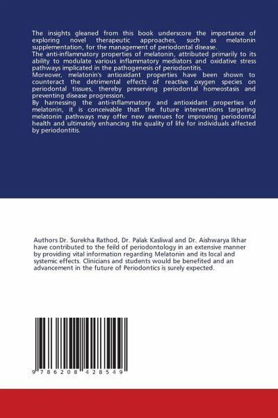 The insights gleaned from this book underscore the importance of exploring novel therapeutic approaches, such as melatonin supplementation, for the management of periodontal disease. The anti-inflammatory properties of melatonin, attributed primarily to its ability to modulate various inflammatory mediators and oxidative stress pathways implicated in the pathogenesis of periodontitis. Moreover, melatonin's antioxidant properties have been shown to counteract the detrimental effects of reactive oxygen species on periodontal tissues, thereby preserving periodontal homeostasis and preventing disease progression.By harnessing the anti-inflammatory and antioxidant properties of melatonin, it is conceivable that the future interventions targeting melatonin pathways may offer new avenues for improving periodontal health and ultimately enhancing the quality of life for individuals affected by periodontitis.