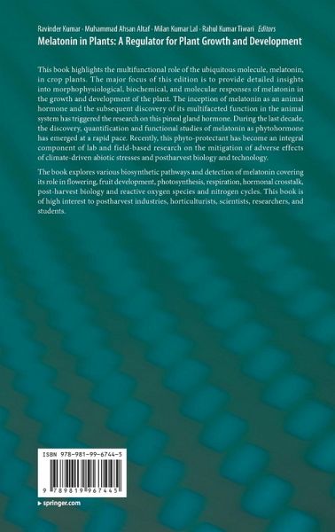 Ch 1. Melatonin discovery and divergent biosynthetic pathways in plant.- Ch 2. Melatonin detection and quantification techniques.- Ch 3. Melatonin-mediated regulation of germination, plant establishment and vegetative development.- Ch 4. Regulatory role of melatonin in flowering, fruit setting and ripening.- Ch 5. Regulatory role of melatonin in photosynthesis and respiration.- Ch 6. Phytohormonal cross-talk with melatonin in plant.- Ch 7. Interaction of melatonin with reactive oxygen species in plants.- Ch 8. Reactive Nitrogen Species (RNS) and Melatonin Interaction in Plant.- Ch 9. Diverse functional role of melatonin in post-harvest biology.- Ch 10. Regulatory role of melatonin in post-harvest management of vegetables and fruits.- Ch 11. Synergistic effect of melatonin in plant growth and development in stress mitigation.- Ch 12. Melatonin mediated regulation of growth, production and protection in forest plant species.- Ch 13. Melatonin: A promising tool against climate change and food security for better plant survival.