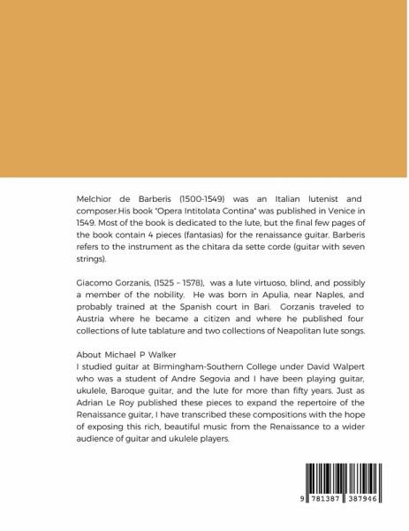 Melchior de Barberis (1500-1549) was an Italian lutenist and composer.His book "Opera Intitolata Contina" was published in Venice in 1549. Most of the book is dedicated to the lute, but the final few pages of the book contain 4 pieces (fantasias) for the renaissance guitar. Barberis refers to the instrument as the chitara da sette corde (guitar with seven strings). Giacomo Gorzanis, (1525 - 1578), was a lute virtuoso, blind, and possibly a member of the nobility. He was born in Apulia, near Naples, and probably trained at the Spanish court in Bari. Gorzanis traveled to Austria where he became a citizen and where he published four collections of lute tablature and two collections of Neapolitan lute songs.