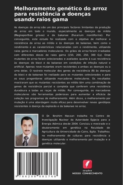 As doenças do arroz são um dos principais factores limitantes da produção de arroz em todo o mundo, especialmente as doenças do míldio (Magnaporthae grisea) e da bakanae (Fusarium moniliforme). Por conseguinte, este estudo foi realizado com o objetivo de melhorar a resistência do arroz ao míldio e às doenças de bakanae, bem como o rendimento e as caraterísticas relacionadas com o rendimento, utilizando raios gama e marcadores moleculares. Os grãos de arroz foram irradiados com diferentes doses de raios gama (150, 200, 250, 300 Gy). Onze mutantes de arroz foram selecionados e avaliados quanto à sua resistência às doenças do blast e da bakanae em condições de infeção natural e artificial. Apenas nove mutantes eram resistentes a ambas as doenças ou a uma delas. O rastreio molecular dos genes de resistência (R) às doenças do blast e da bakanae foi realizado para os mutantes selecionados e para os seus progenitores utilizando marcadores moleculares. Os resultados mostraram que os mutantes resistentes ao míldio têm uma combinação de genes de resistência parcial e completa que conferem uma resistência duradoura a todas as raças de míldio. Por conseguinte, os marcadores moleculares são ferramentas poderosas para aumentar a eficácia da seleção nos programas de melhoramento. Além disso, o melhoramento por mutação é uma abordagem muito eficaz para desenvolver novos genótipos resistentes à doença da explosão e da bakanae no arroz.