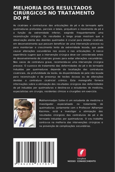 As cicatrizes e contracturas das articulações do pé e do tornozelo após queimaduras profundas, parciais e totais, prejudicam o movimento do pé e a função da extremidade inferior, exigindo frequentemente uma reconstrução cirúrgica. Os resultados a longo prazo mostram que a observação atenta dos doentes queimados é crucial para detetar cicatrizes em desenvolvimento que possam beneficiar de uma intervenção precoce ou para monitorizar o crescimento lento da extremidade lesada, que pode causar alterações secundárias nos ossos e nas articulações. A nossa experiência sugere que a intervenção cirúrgica deve ser considerada antes do desenvolvimento de cicatrizes graves para evitar alterações secundárias. Nos casos de contratura grave, recomenda-se uma intervenção cirúrgica precoce. O sucesso do tratamento das deformidades do pé e do tornozelo induzidas por queimaduras depende da localização das contraturas cicatriciais, da profundidade da lesão, da disponibilidade de pele não lesada para reconstrução e da presença de lesões ósseas ou de alterações devidas a contratura cicatricial crónica. Esta monografia fornece informações sobre a otimização dos resultados cirúrgicos das deformidades do pé induzidas por queimaduras e destina-se a estudantes de medicina, especialistas em cirurgia, residentes clínicos e cirurgiões em exercício.